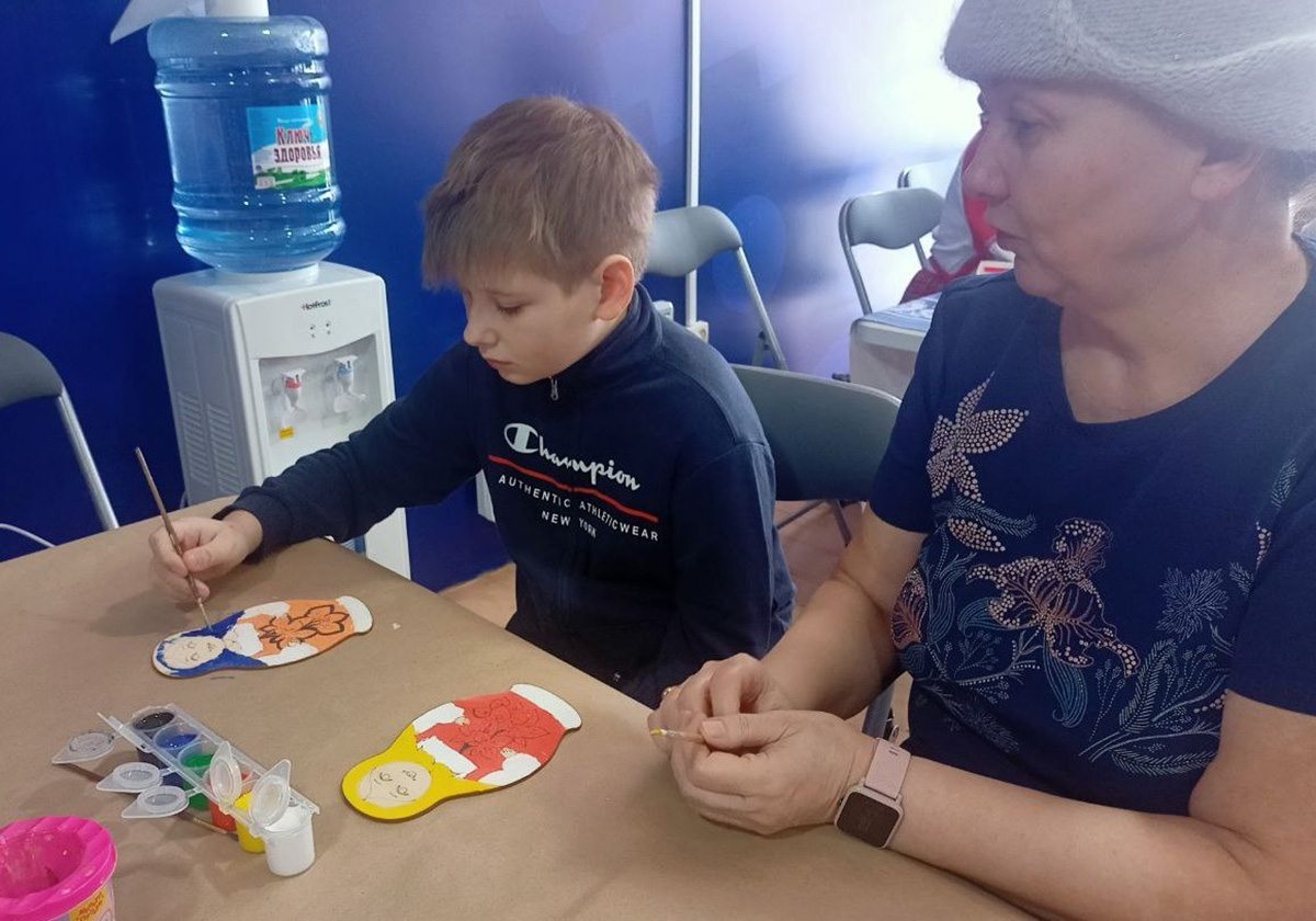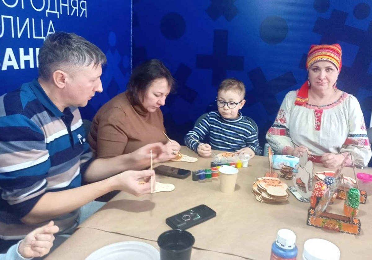 Сотрудник музея проводит в Мастерской Деда Мороза мастер-класс по касимовской росписи. Это занятие заинтересовало как детей, так взрослых. Участники, погрузившись в творческий процесс, старательно расписывают матрёшек.